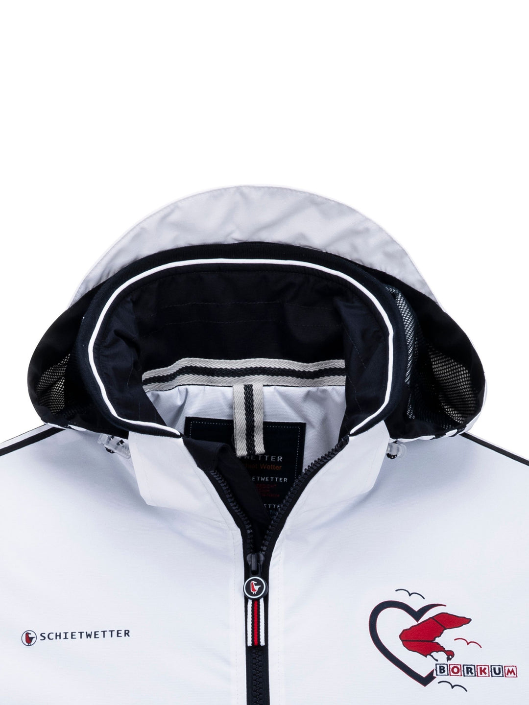 Dank der wind- und wasserdichten Membran (Wassersäule 10.000 mm) bleibst du auch bei unbeständigem Wetter angenehm trocken. Die abnehmbare Kapuze mit reflektierenden Details und Koordinatenprint bietet Schutz und sorgt für Sichtbarkeit bei Dämmerung. Liebevoll platzierte Highlights wie die Borkum-Silhouette mit Herzsymbol auf Brust und Rücken verleihen dem Design eine persönliche Note.