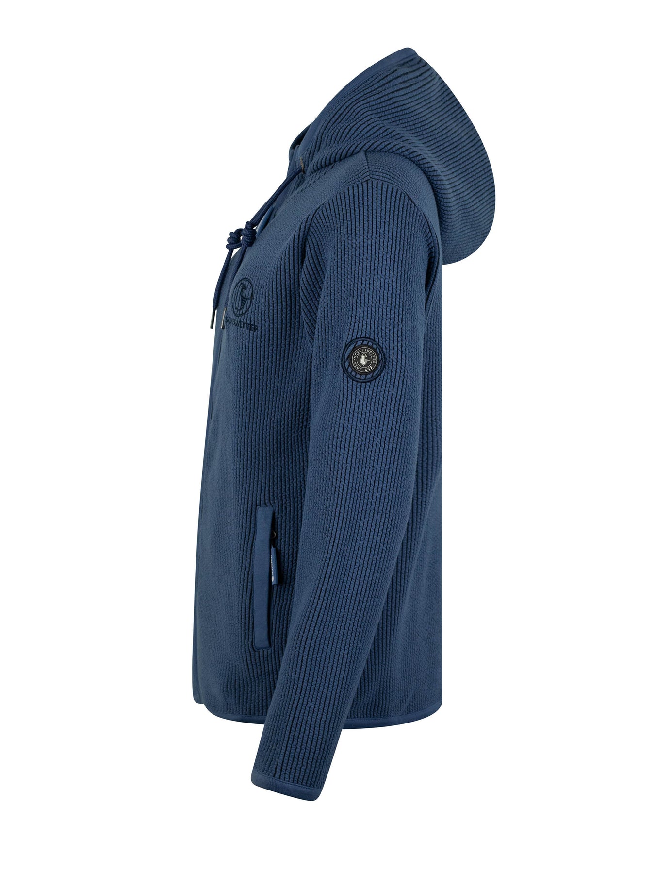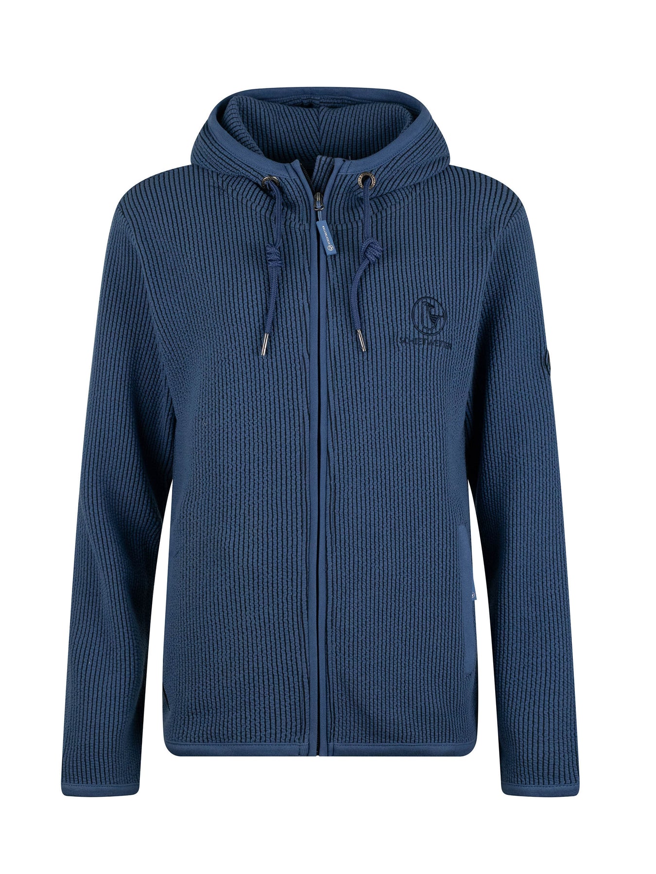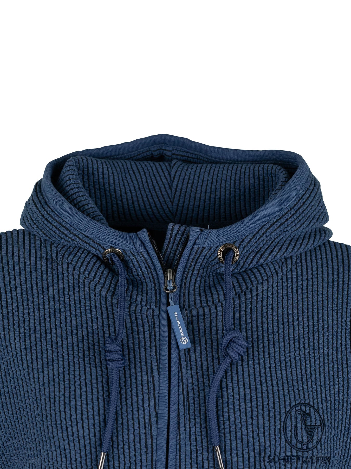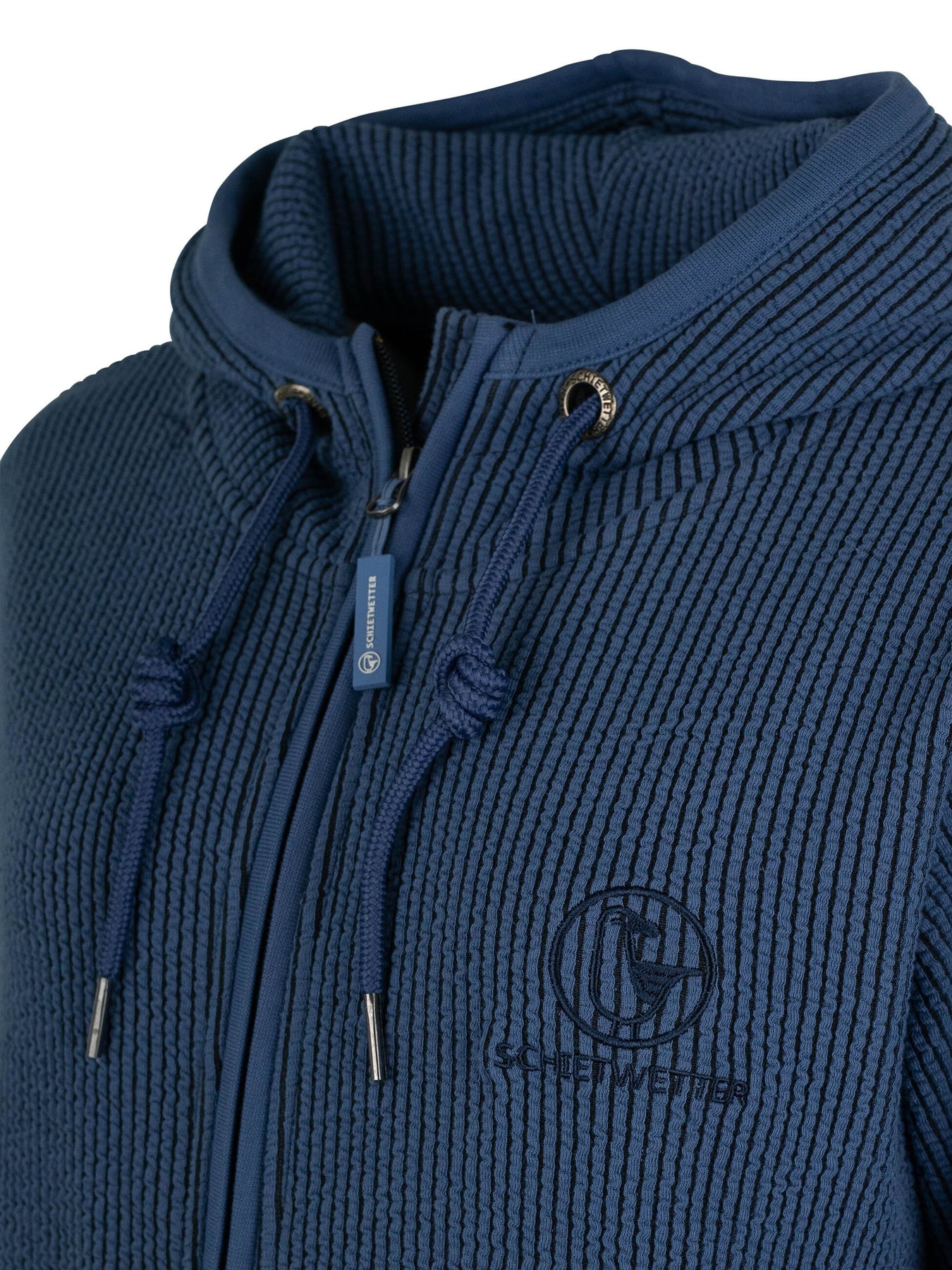 Unsere Sweatjacke 'Runa' ist genau so ein Teil. Ihr Geheimnis ist die einzigartige, gerippte Oberflächenstruktur, die sofort ins Auge fällt und sich wunderbar weich und wertig anfühlt. Sie kombiniert die Gemütlichkeit deiner Lieblings-Sweatjacke mit einem außergewöhnlichen Look. Wenn du sie anziehst, wirst du die wohlige Wärme und den hohen Kuschelfaktor lieben. Für den unverkennbaren Schietwetter-Charme sorgen die dicken, geknoteten Kordeln an der Kapuze, die an echtes Tauwerk erinnern. Der praktische Reißverschluss und die seitlichen Taschen machen sie dabei zum perfekten, unkomplizierten Begleiter für jeden Tag.