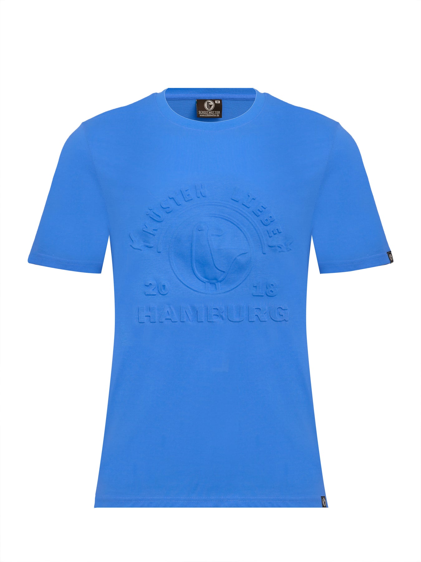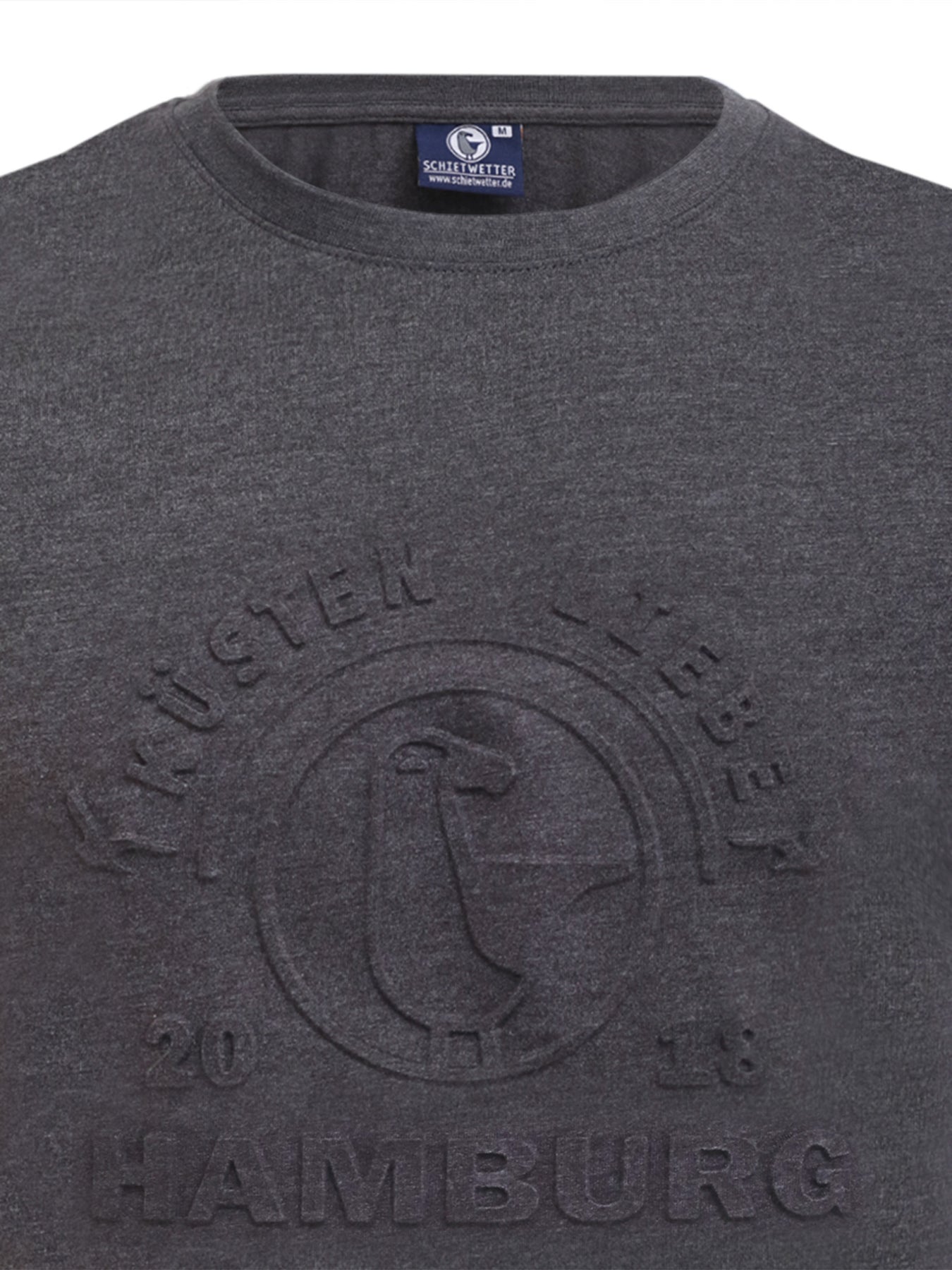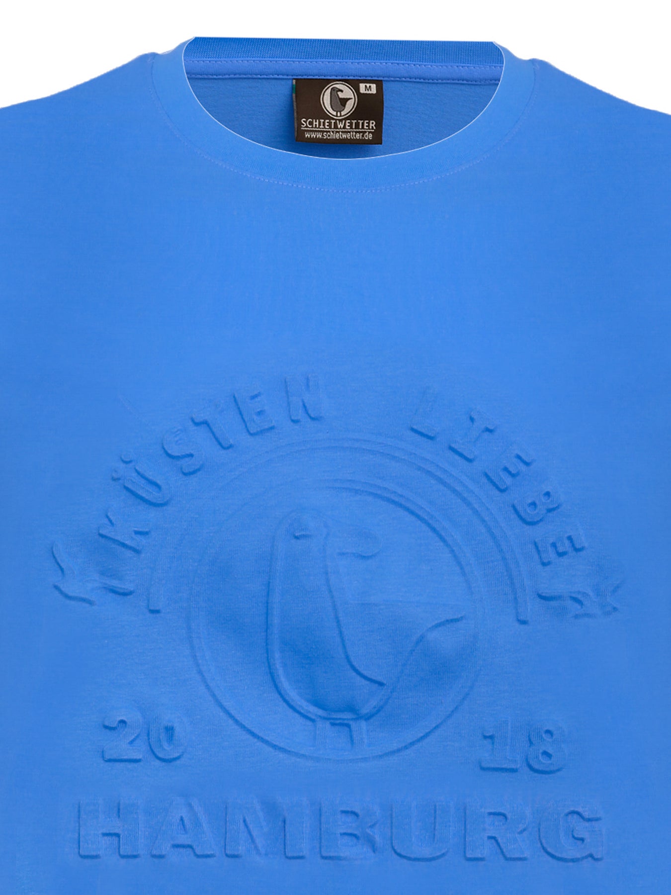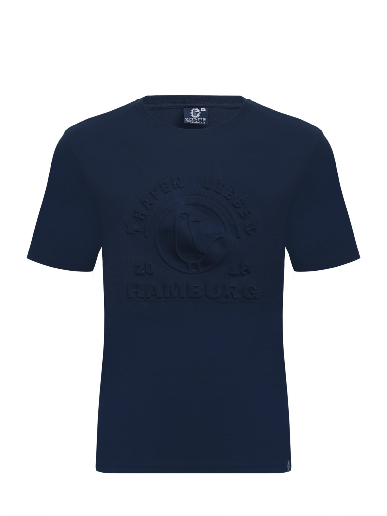 Gefertigt aus 100% Baumwolle, sorgt das T-Shirt für ein angenehmes Tragegefühl und steht für Nachhaltigkeit und Umweltbewusstsein. Der klassische Rundhalsausschnitt verleiht dir eine lässige Passform, während die hochwertige 3D-Prägung auf der Brust das maritime Statement setzt: Die legendäre Schietwettermöwe mit der Rundschrift „Hafenliebe“ und darunter „Hamburg“ – ohne Foliendruck, langlebig und stilvoll.