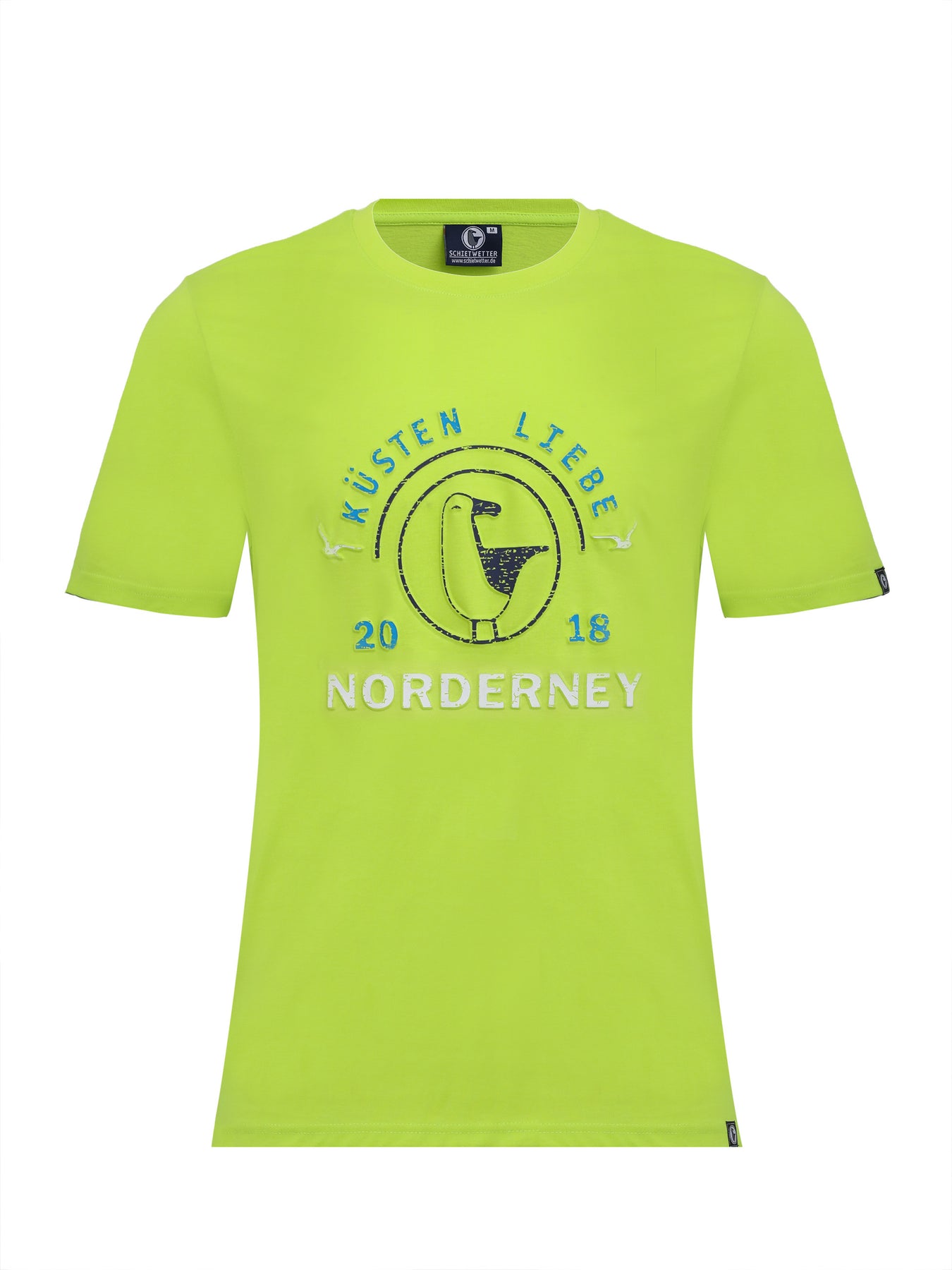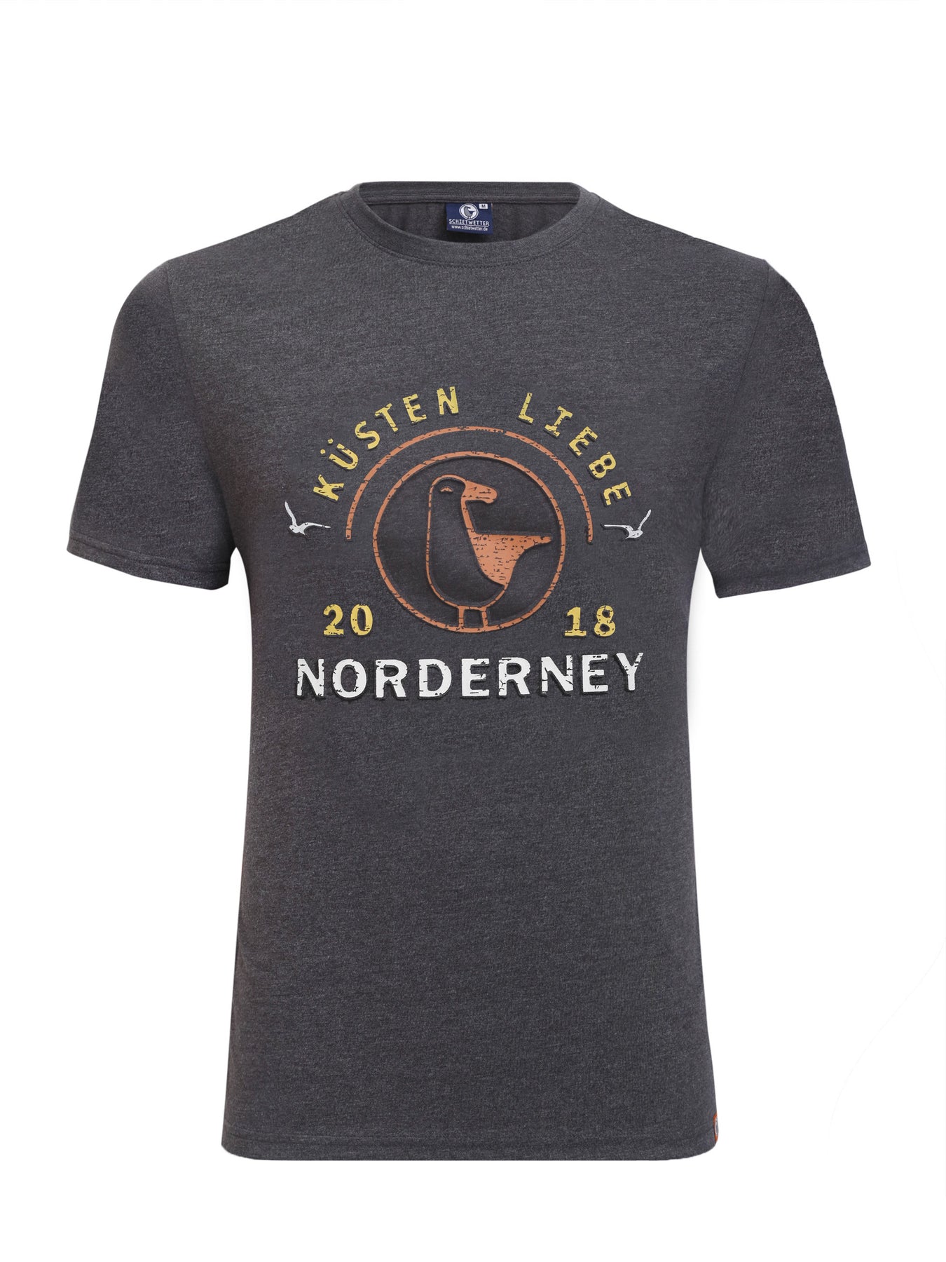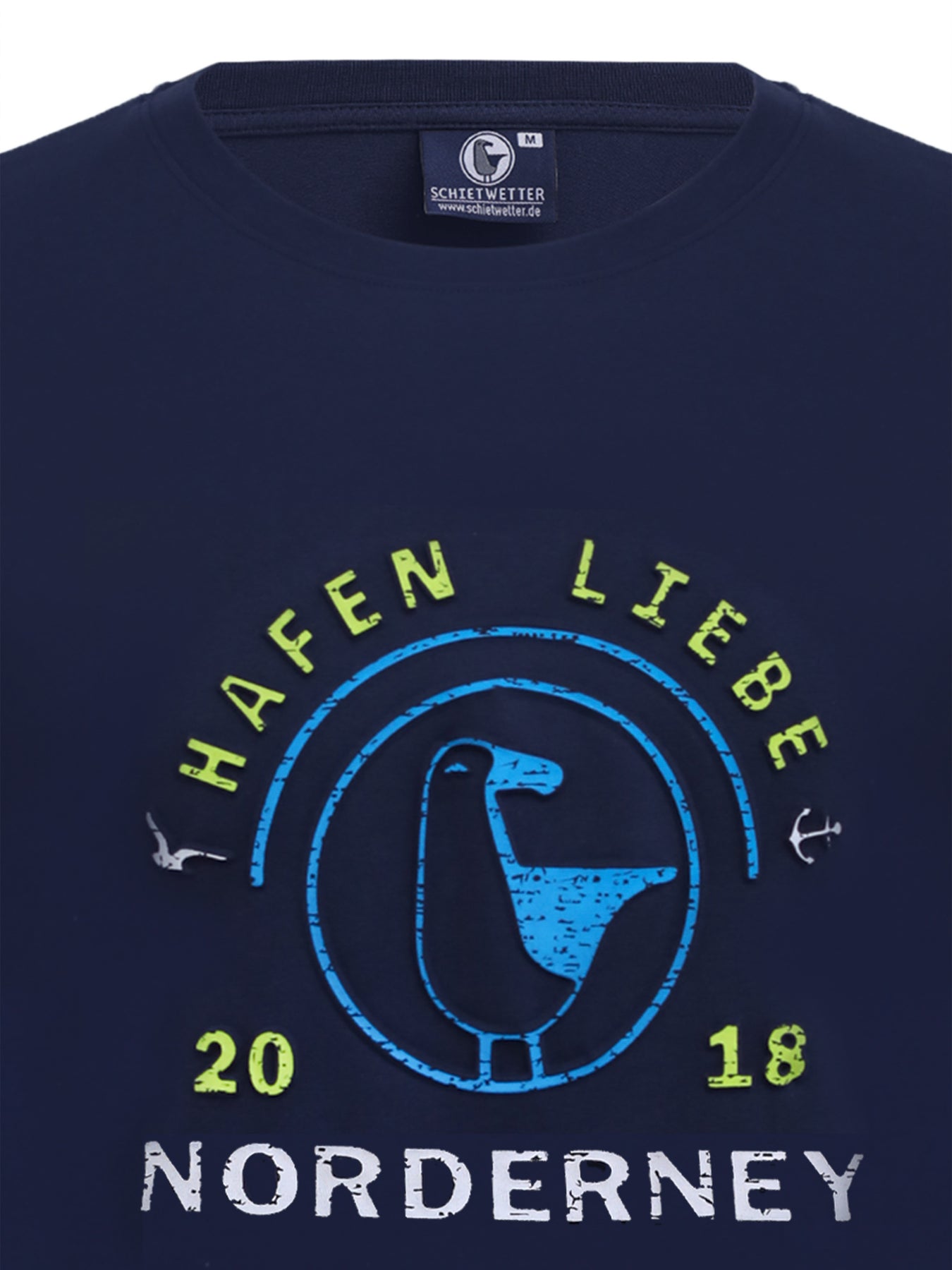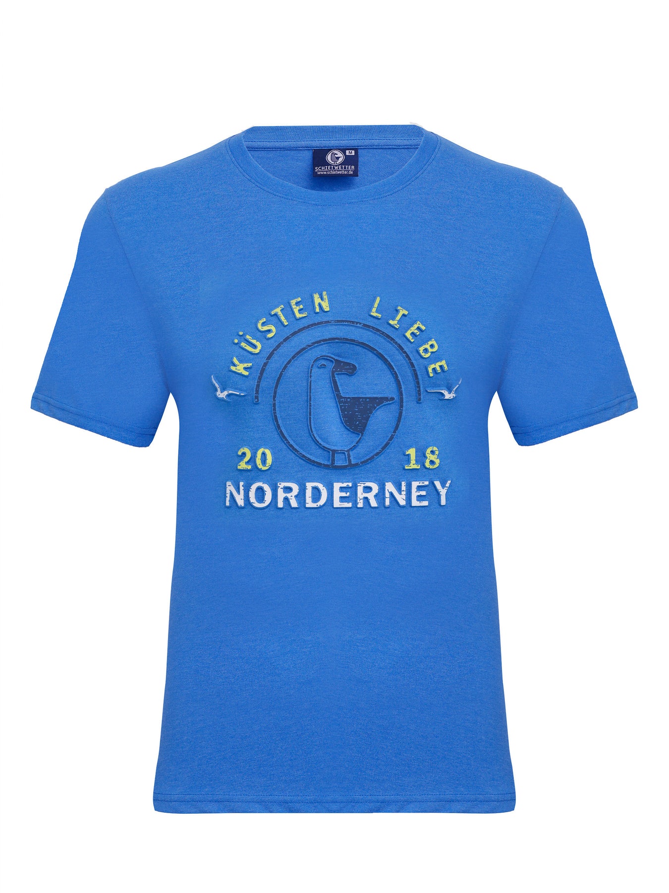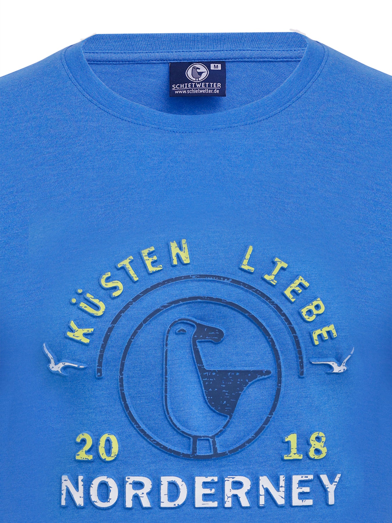 Hergestellt aus Baumwolle, garantiert das Shirt ein angenehmes Tragegefühl und Komfort. Das Highlight ist die hochwertige 3D-Prägung mit buntem Foliendruck: Eine markante Schietwettermöwe ziert die Brust, zusammen mit der Rundschrift „Küstenliebe“ und dem darunterstehenden „Norderney“ – ein echtes Statement für alle, die die Insel und das maritime Leben im Herzen tragen.