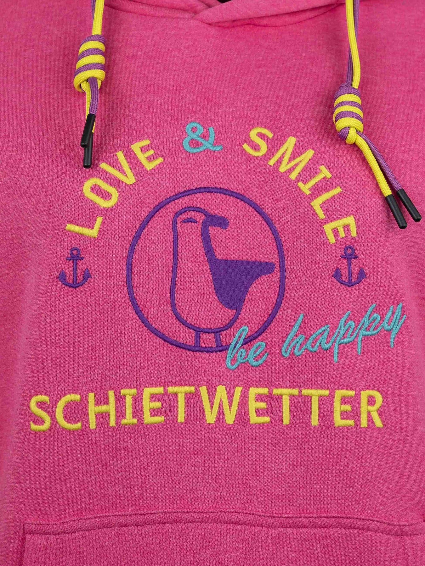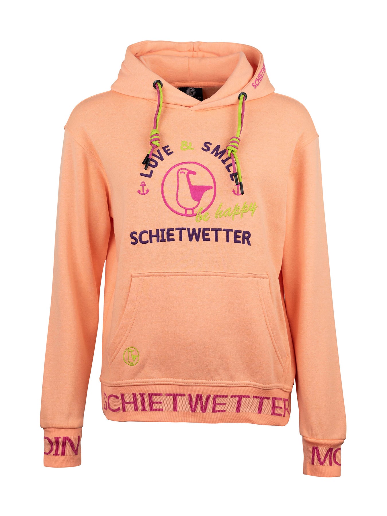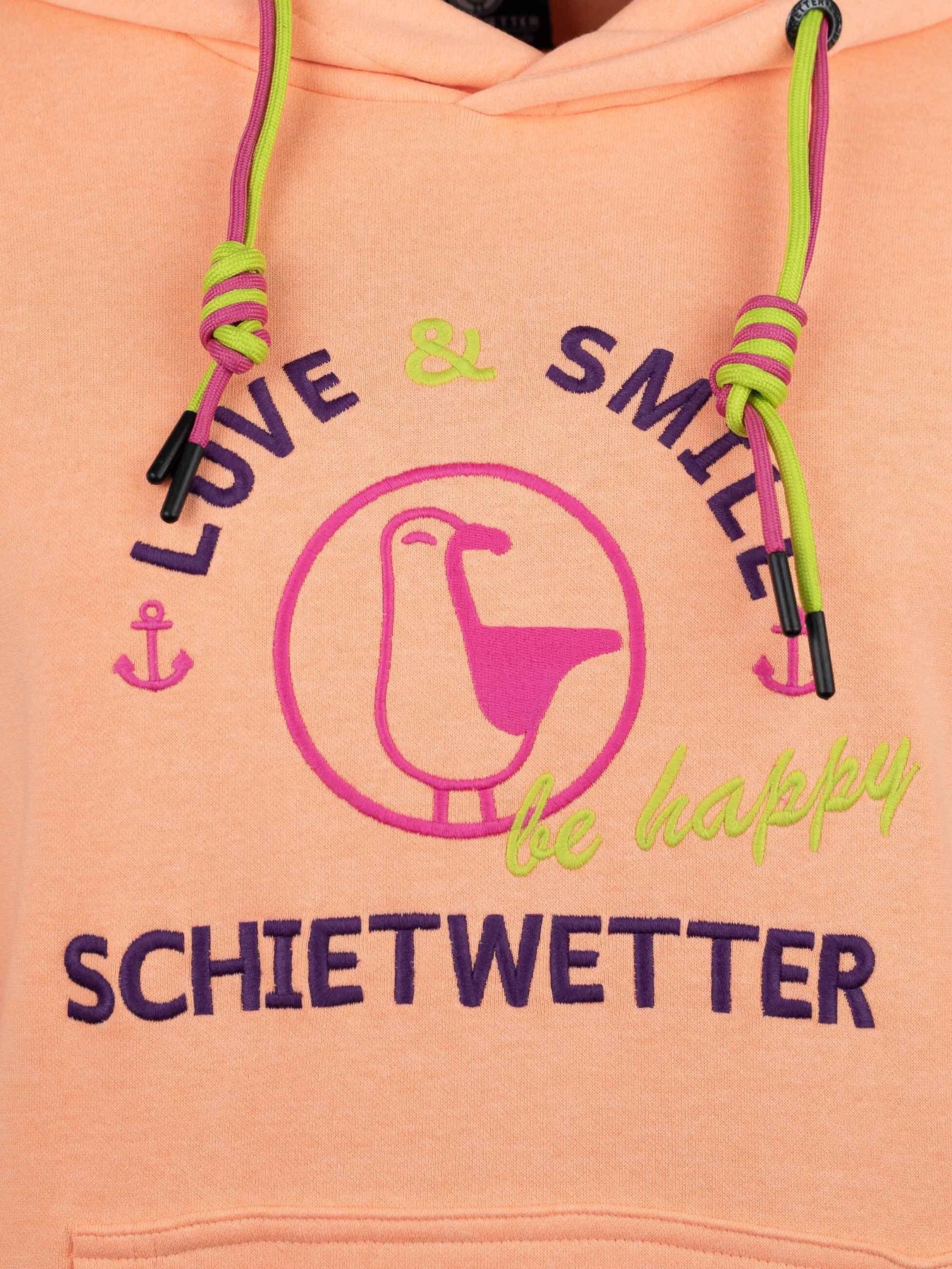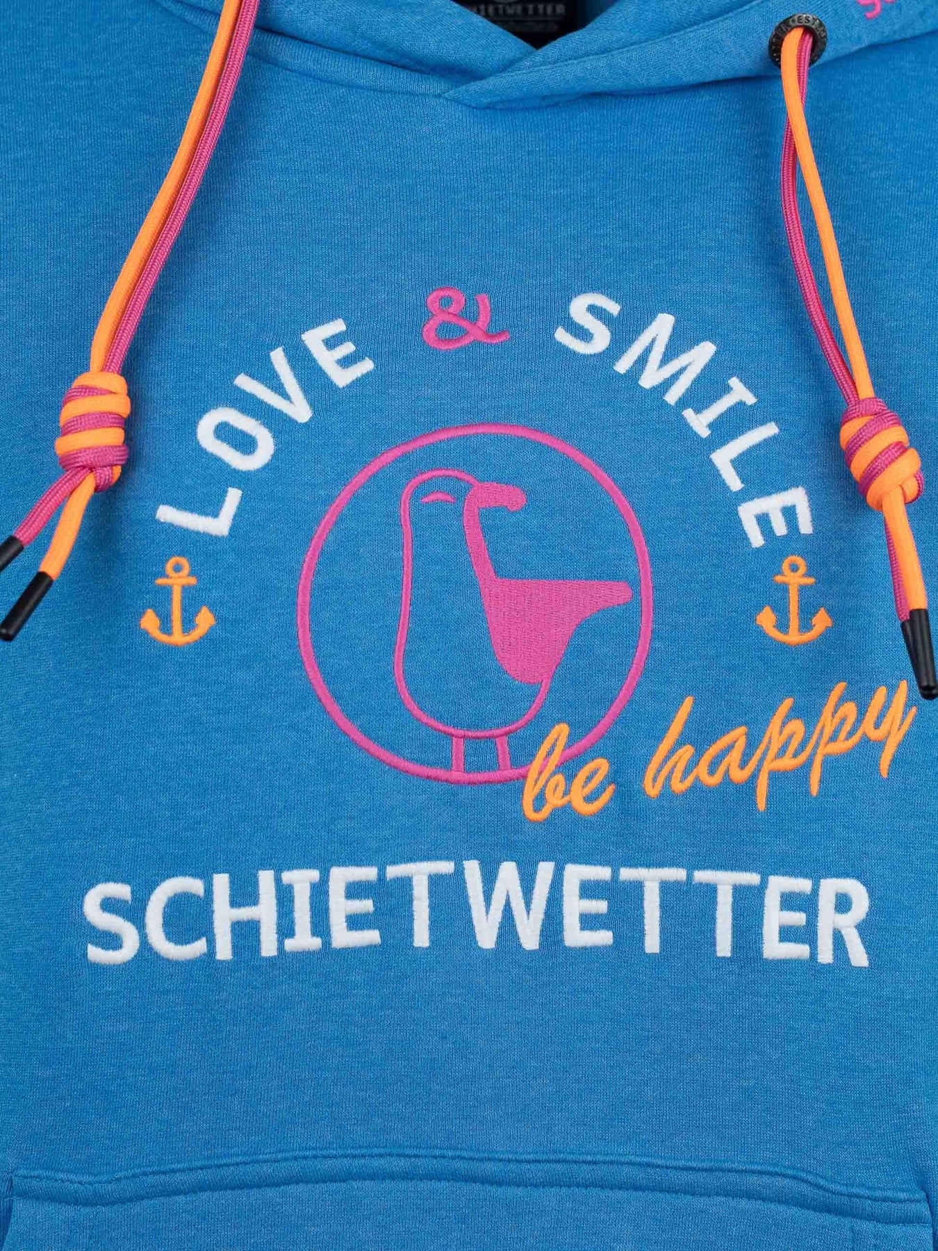 Mit seiner liebevollen Stickerei, den zweifarbigen Kordeln an der Kapuze und den maritimen Details wie dem gestickten Schietwetter-Schriftzug am Bauchbund sowie Moin an den Ärmeln bringt dieser Langarm Hoodie echtes Küstenflair in deinen Alltag. Die große Kängurutasche wärmt nicht nur deine Hände, sondern bietet auch Platz für Kleinigkeiten unterwegs.