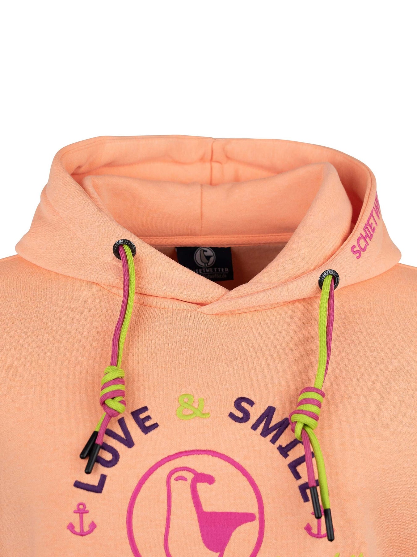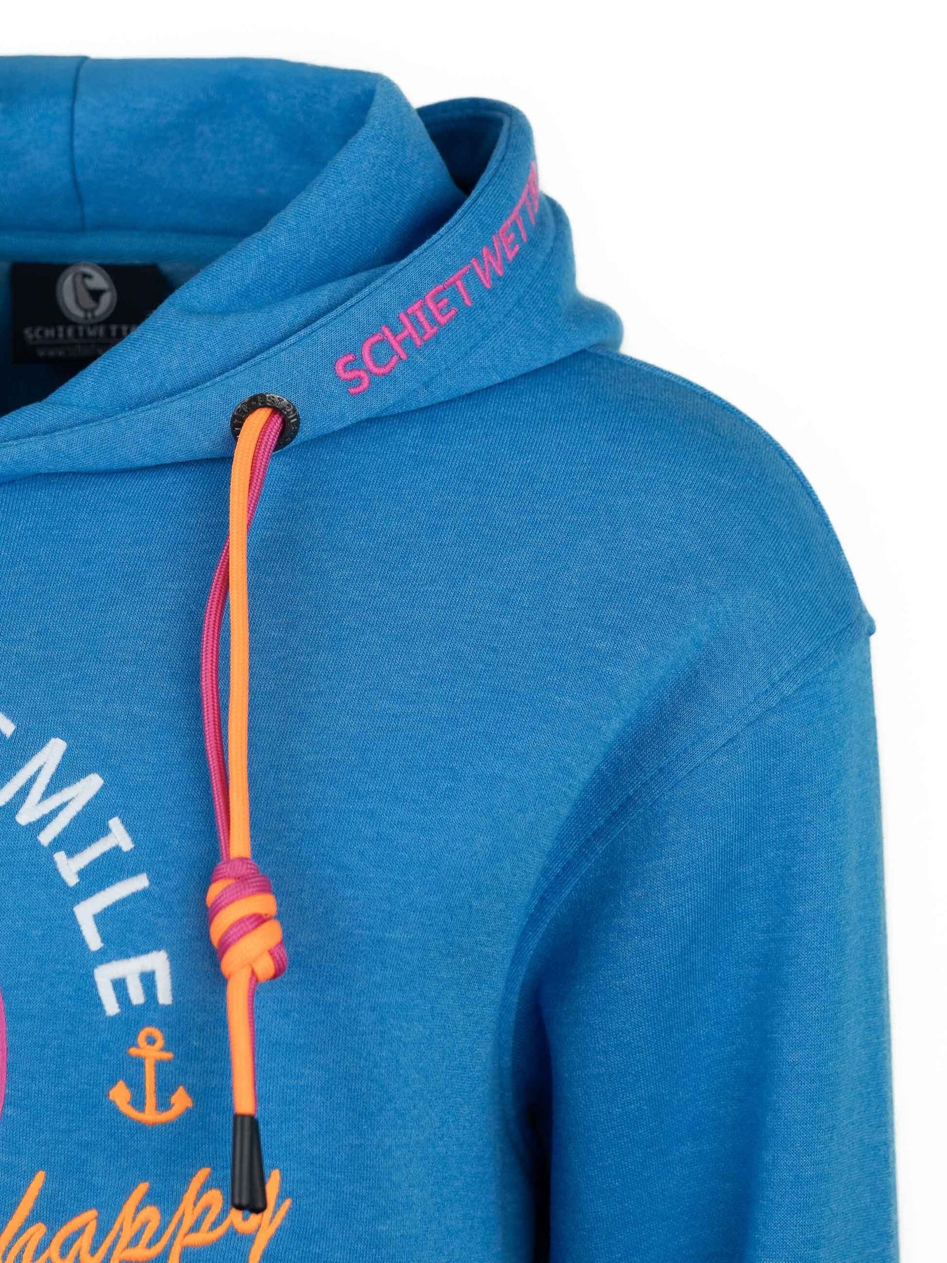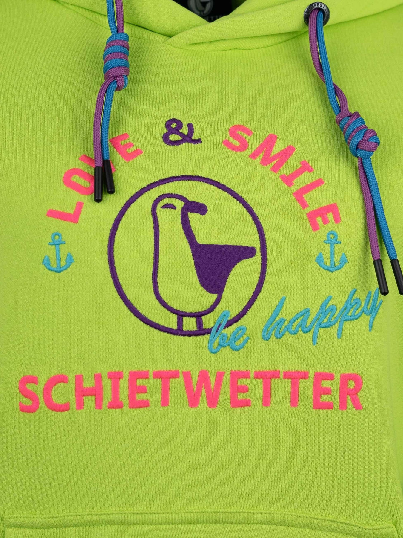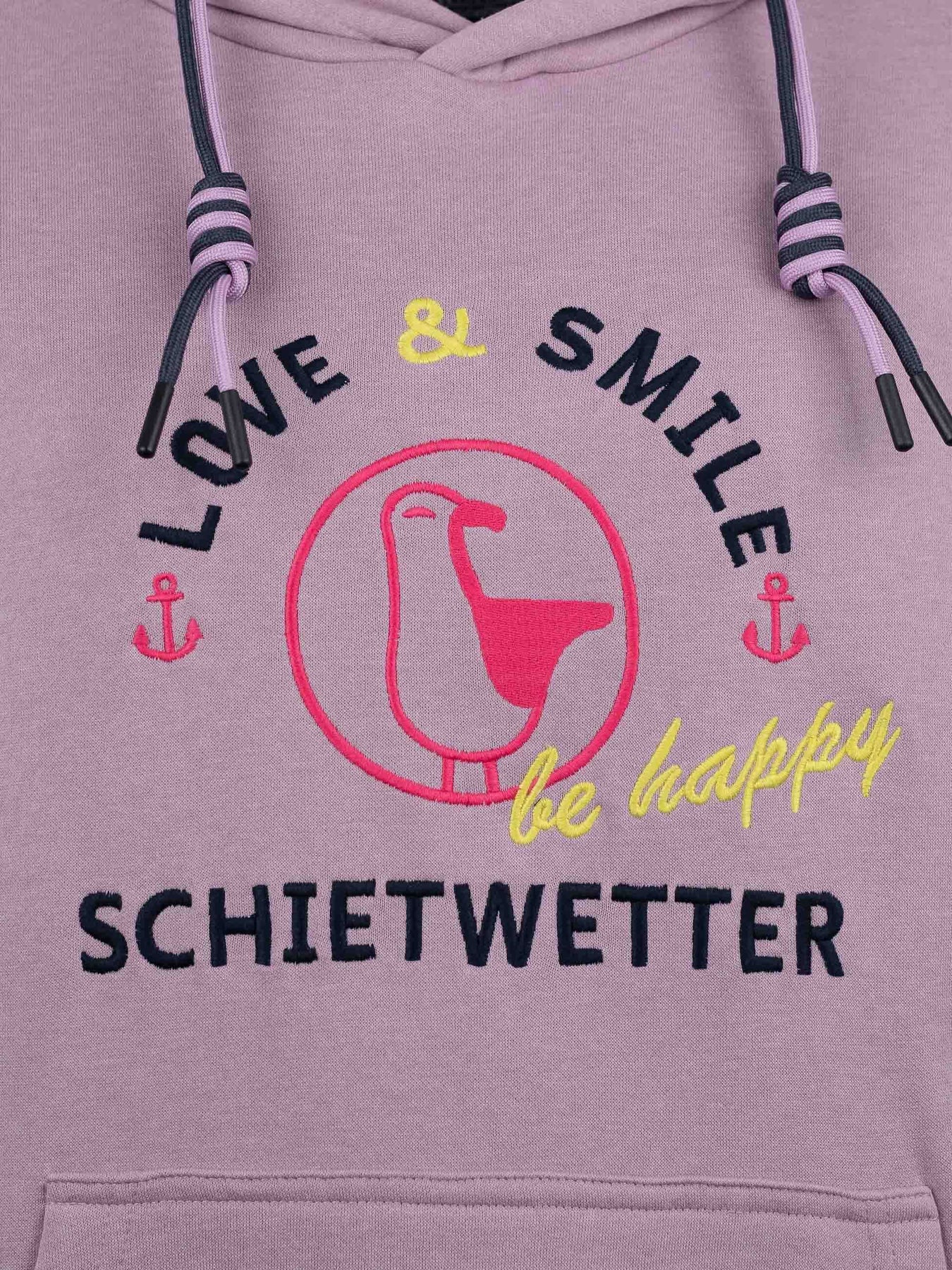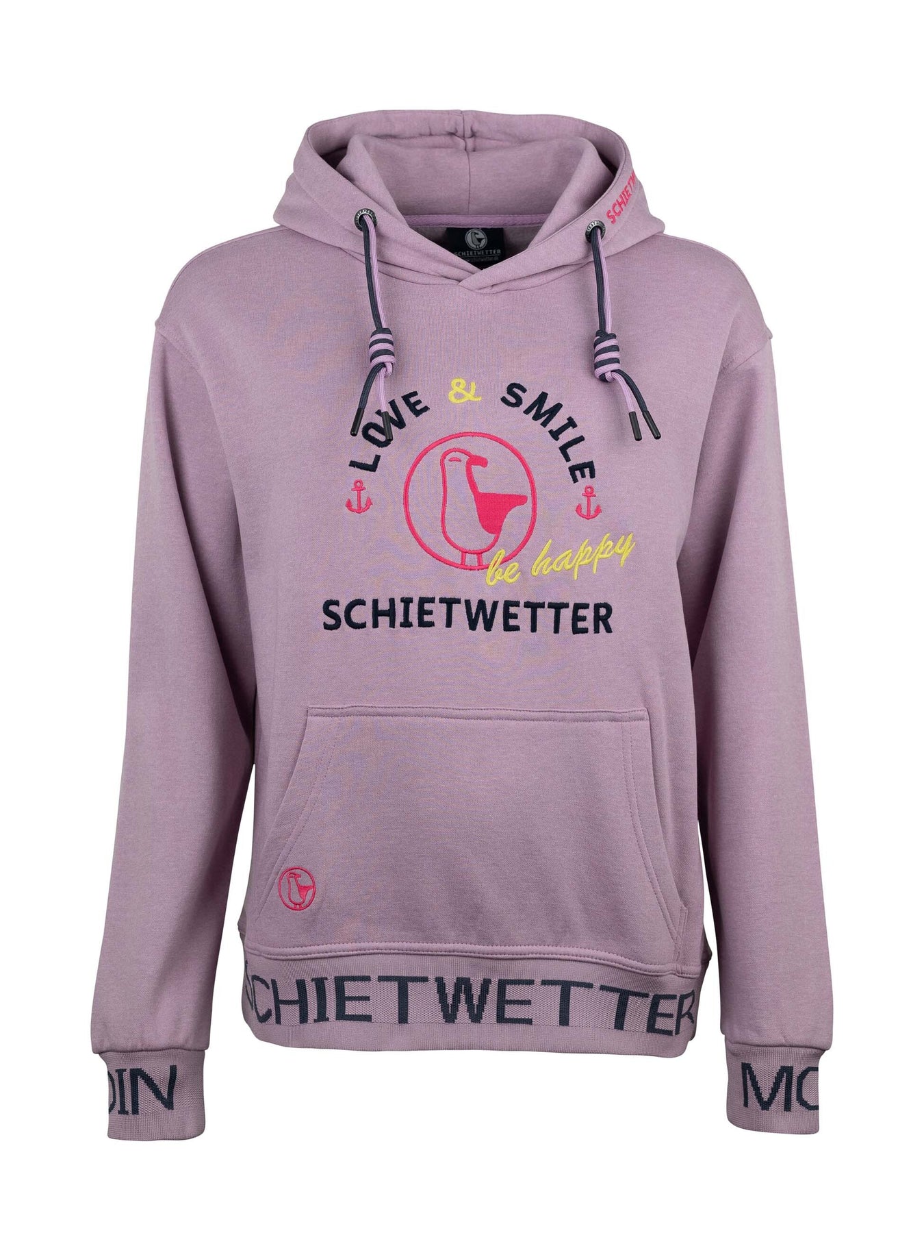 Mit seiner liebevollen Stickerei, den zweifarbigen Kordeln an der Kapuze und den maritimen Details wie dem gestickten Schietwetter-Schriftzug am Bauchbund sowie Moin an den Ärmeln bringt dieser Langarm Hoodie echtes Küstenflair in deinen Alltag. Die große Kängurutasche wärmt nicht nur deine Hände, sondern bietet auch Platz für Kleinigkeiten unterwegs.