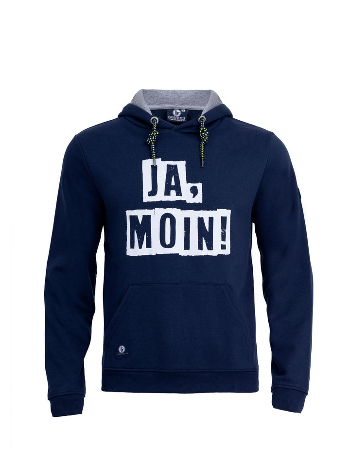 Der Hoodie „Ja Moin“ ist der perfekte Kapuzenpullover für alle Männer, die auf einen lässigen Look und hohen Tragekomfort Wert legen. Dieser stylische Männer Hoodie besticht durch seine sportliche Passform und die maritimen Akzente. Mit seinem farblich abgesetzten Kapuzeninneren und dem auffälligen Schriftzug „Ja, Moin!“ setzt der Pullover einen coolen, norddeutschen Akzent.