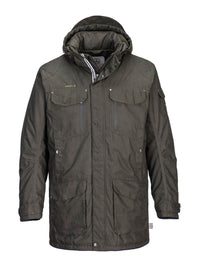 Großzügige Taschen: Die gefütterte Jacke besticht mit einer großen Anzahl an unterschiedlichen Taschen. So bietet der Parka zwei große Taschen mit Druckknöpfen und dahinterliegenden Einschubtaschen, sodass nicht nur für das Hab und Gut gesorgt ist, sondern auch die Hände warm bleiben. An der Brust befinden sich zwei seitlich abgesetzte Taschen mit Reißverschluss. Linksliegend befindet sich hinter der Reißverschluss-Patte eine Reißverschlusstasche mit integriertem Kopfhörer-Kanal. In der Innenseite ist noch eine weitere Tasche mit Reißverschluss. Auf der linken Ärmelseite befindet sich ebenfalls eine Tasche mit Druckverschluss.