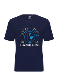 Hergestellt aus 100% Baumwolle, überzeugt das Shirt durch angenehmen Tragekomfort und Atmungsaktivität. Die besondere 3D-Prägung mit buntem Foliendruck auf der Brust macht das Shirt zu einem echten Hingucker: Die markante Schietwettermöwe zusammen mit der Rundschrift „Hafenliebe“ und „Hamburg“ verleiht dem Shirt eine maritime Note, die die raue Schönheit des Hafens in dir weckt.